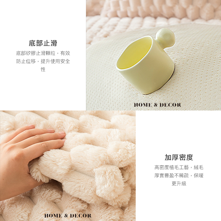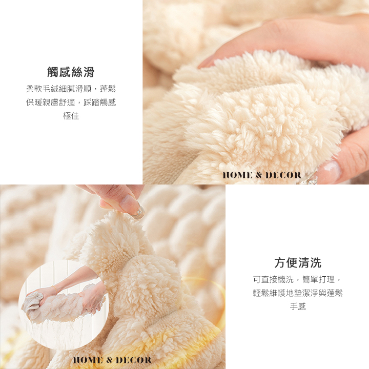 • 觸感絲滑-柔軟毛絨細膩滑順,蓬鬆保暖親膚舒適,踩踏觸感極佳