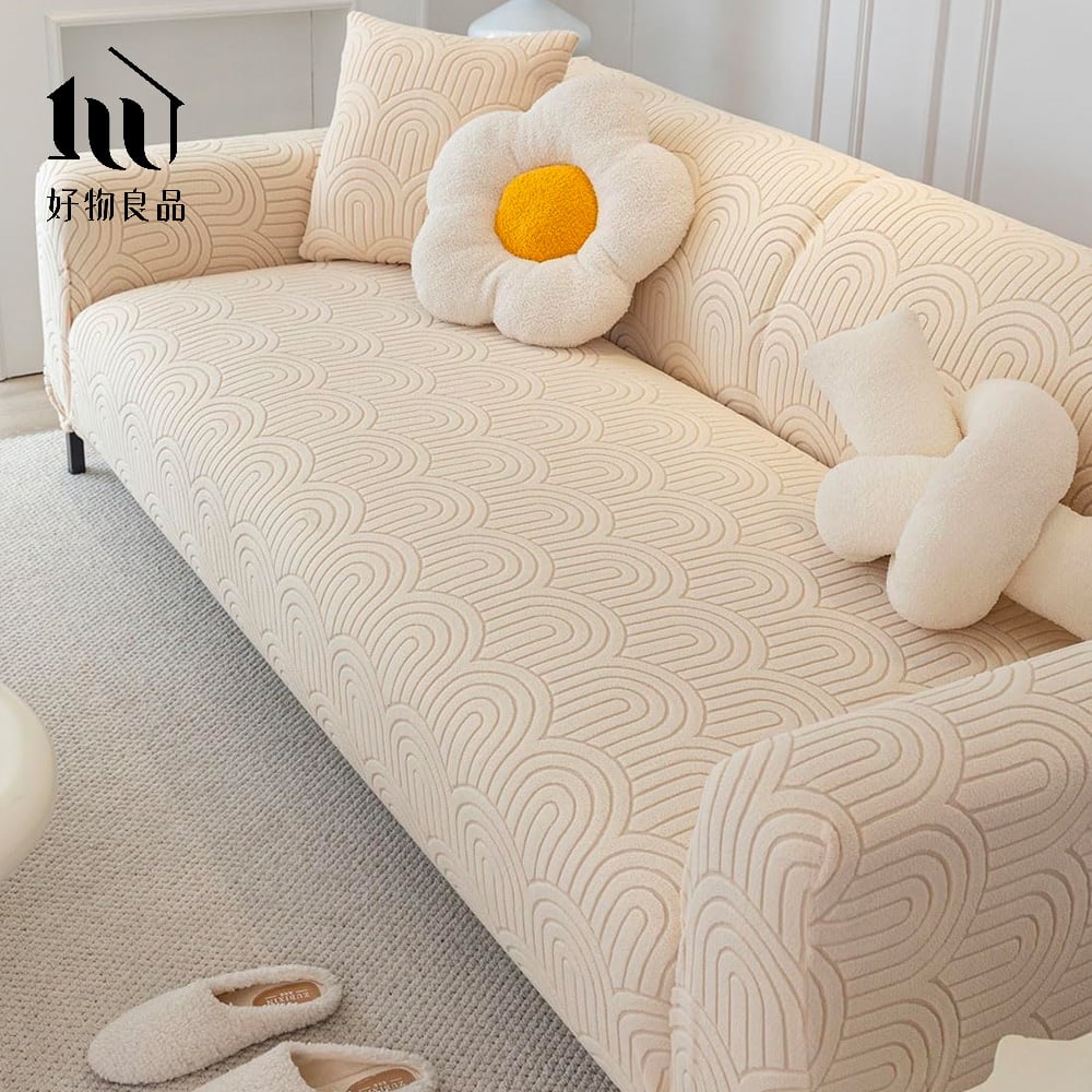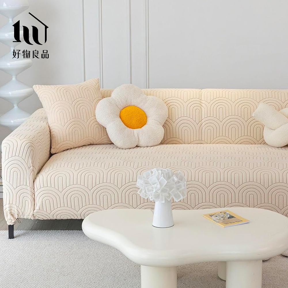 幾何波紋系列《米色》四季通用高彈力立體提花彈力沙發罩|贈抱枕套*1+泡棉條