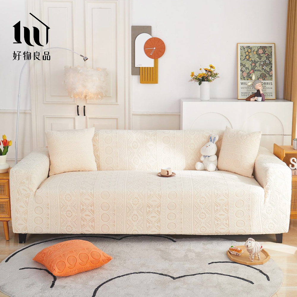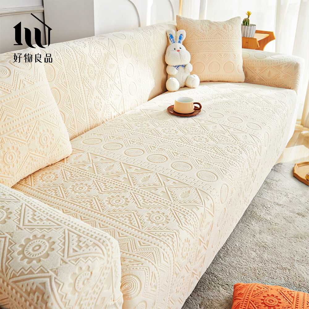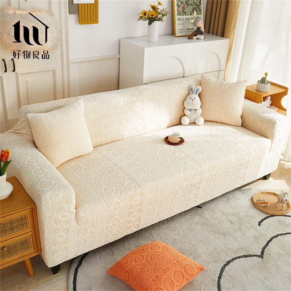 波西米亞系列《米黃色》四季通用高彈力立體提花彈力沙發罩|贈抱枕套*1+泡棉條