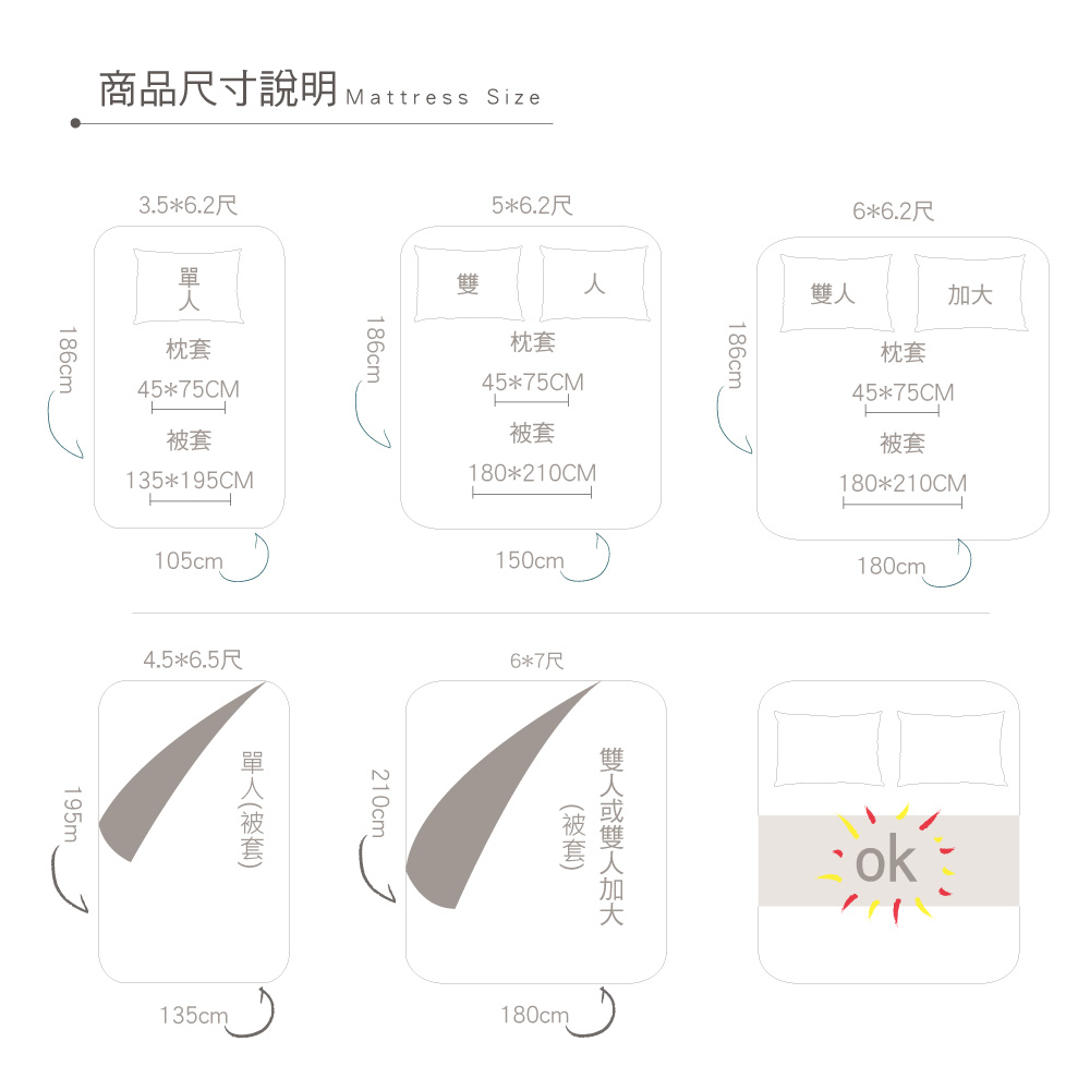 1.雙人鋪棉床罩(152x188cm) x1 /可包覆床墊高度約35cm±3%公分
