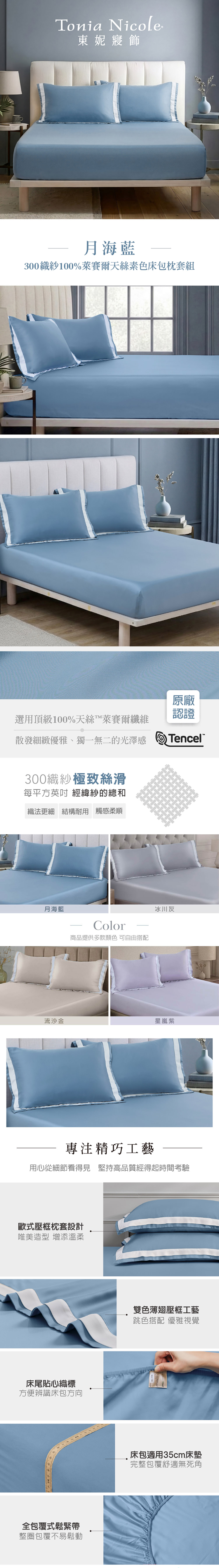 【Tonia Nicole 東妮寢飾】月海藍300織紗100%萊賽爾天絲素色床包枕套組(雙人)