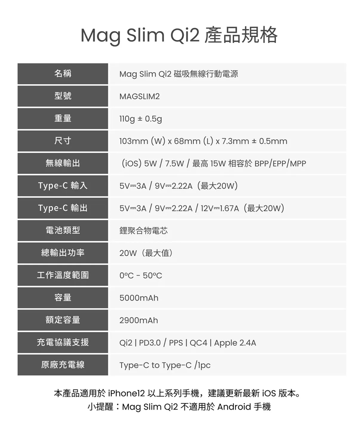 充電協議⽀援:相容於Qi2 | PD3.0 / PPS | QC4 | Apple 2.4A
