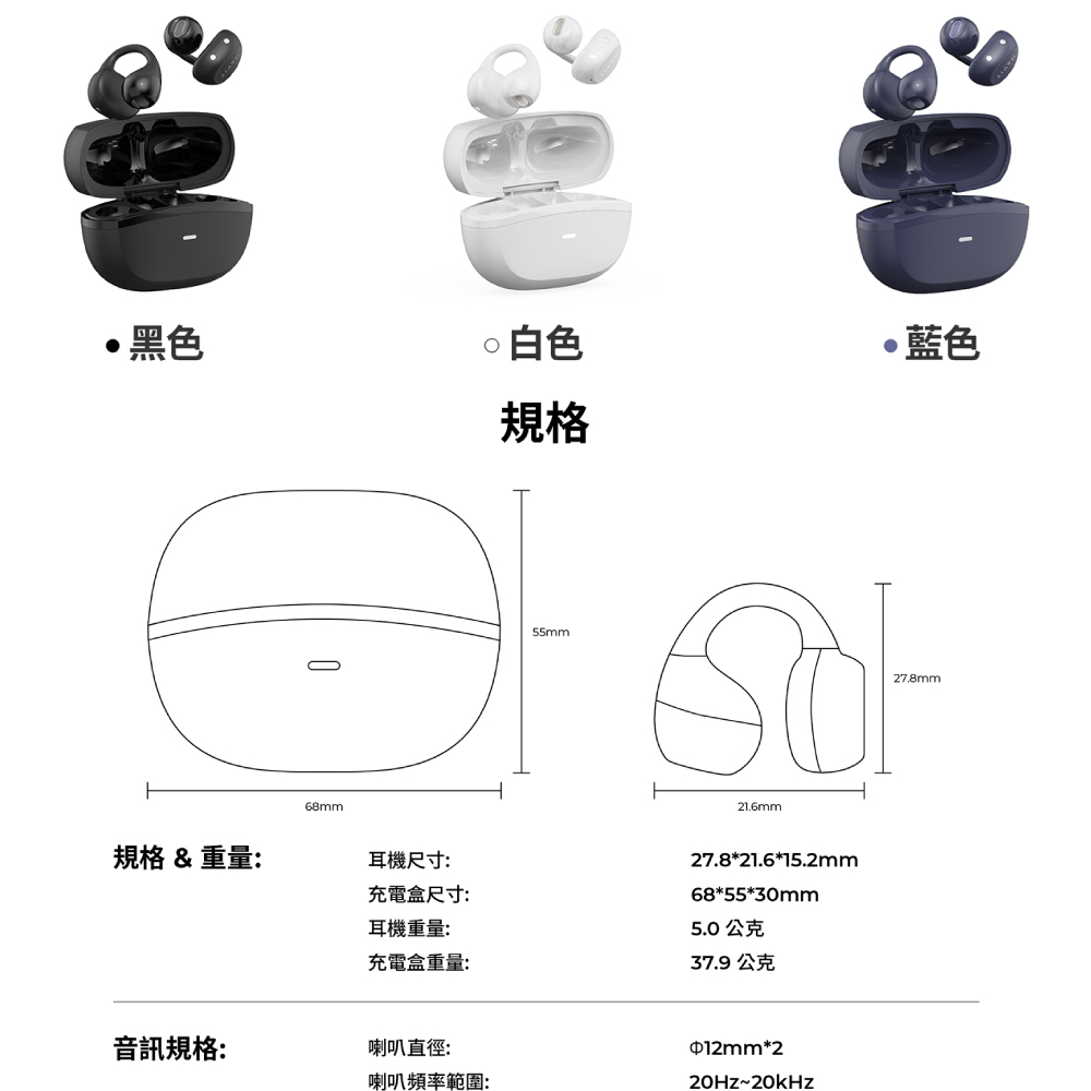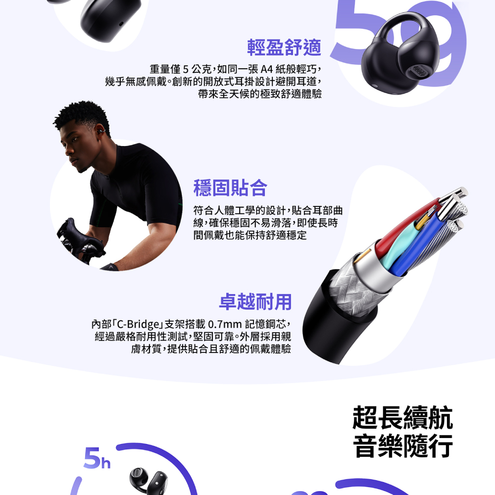 5克超輕機身結合記憶鋼絲耳夾,親膚材質貼合耳廓,久戴舒適。