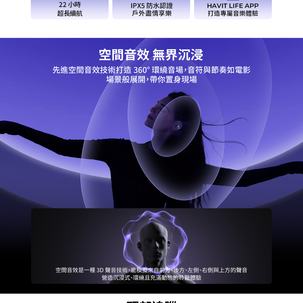 採用先進空間音頻技術,打造立體環繞聲場,讓音樂如電影般在腦海中生動呈現。