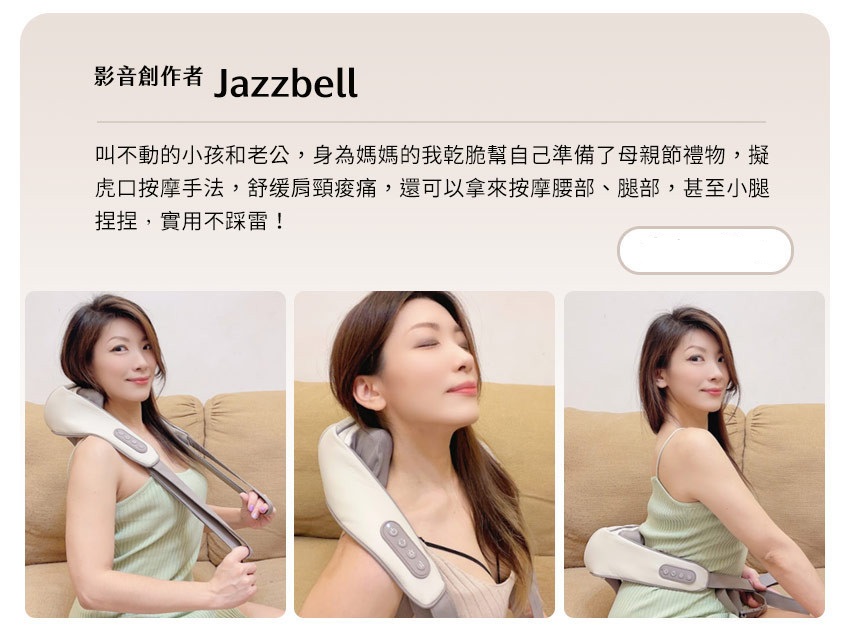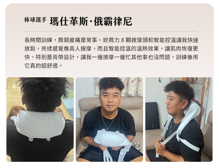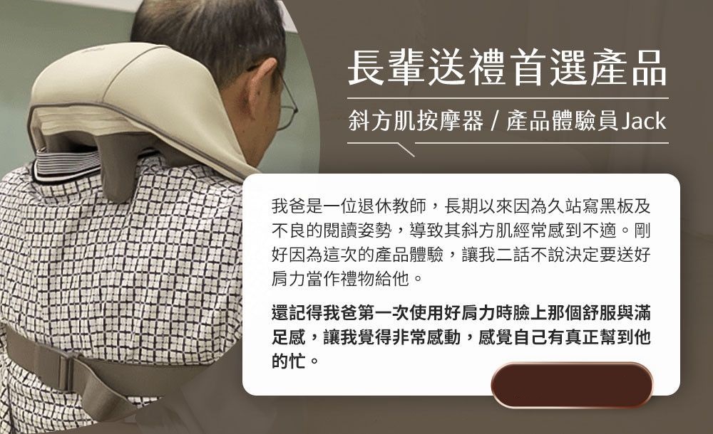肩膀按摩舒適度,除了按摩的力道、抓的距離、角度還要按摩頭的大小材質都會有影響。 最新款的「好肩力」優化了傳統肩膀按摩的老舊設計,最新研發出最適合亞洲人的按摩參數。