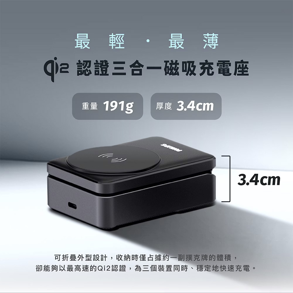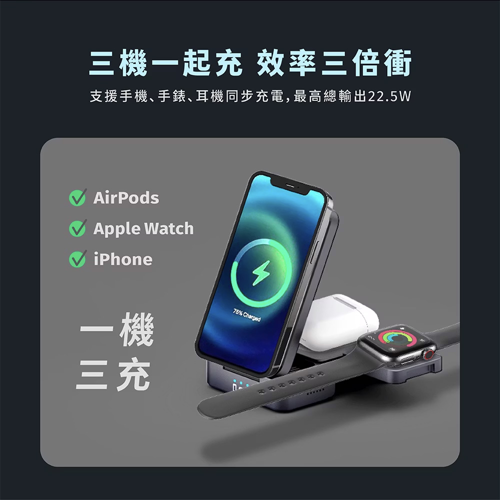 • 三合一磁吸充電座,支援手錶,手機,耳機充電