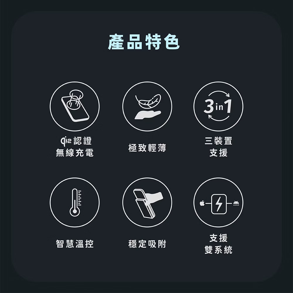 • 相容MagSafe, 支援市面上99%無線充技術