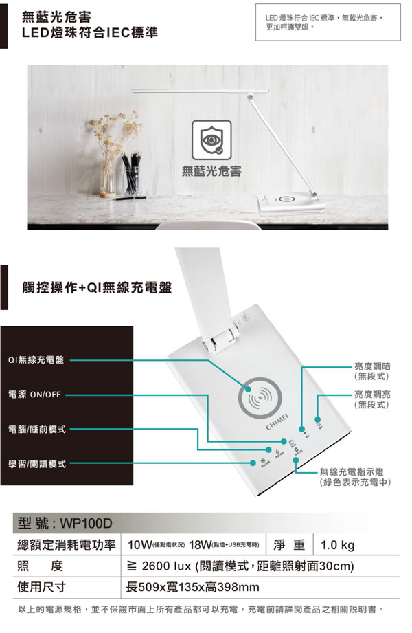 照度:≧ 2600 lux (閱讀模式, 距離照射面 30cm)