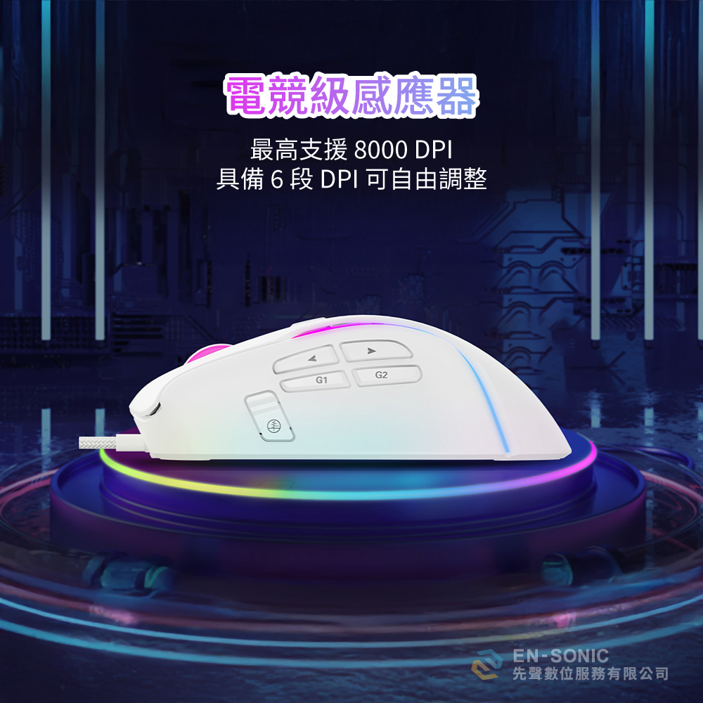 即時 DPI 切換:透過專屬按鍵切換 6 段 DPI,快速調整感應速度以應對不同遊戲場景。