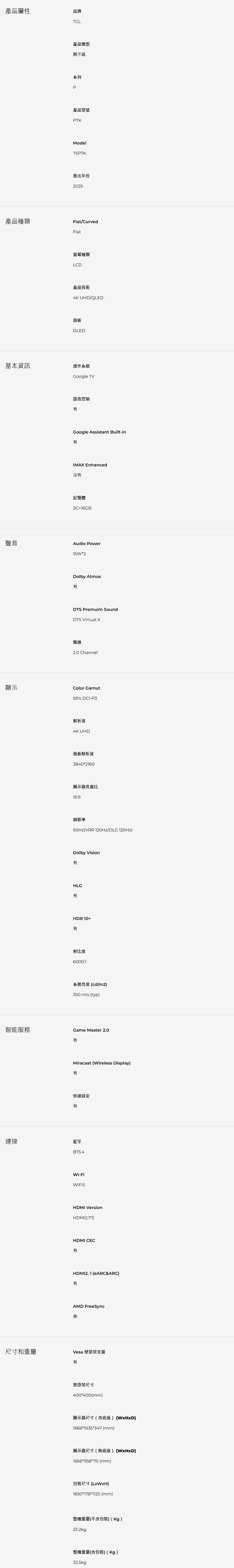 TCL 75P7K 75吋 P7K QLED Google TV顯示器