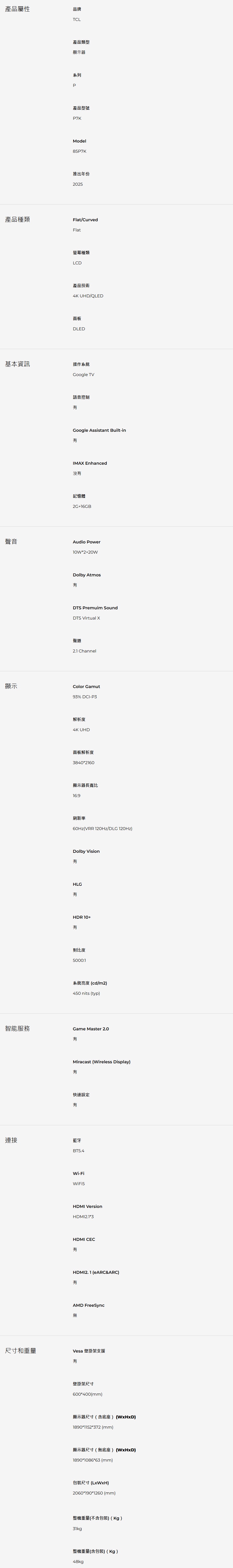 TCL 85P7K 85吋 P7K QLED Google TV顯示器