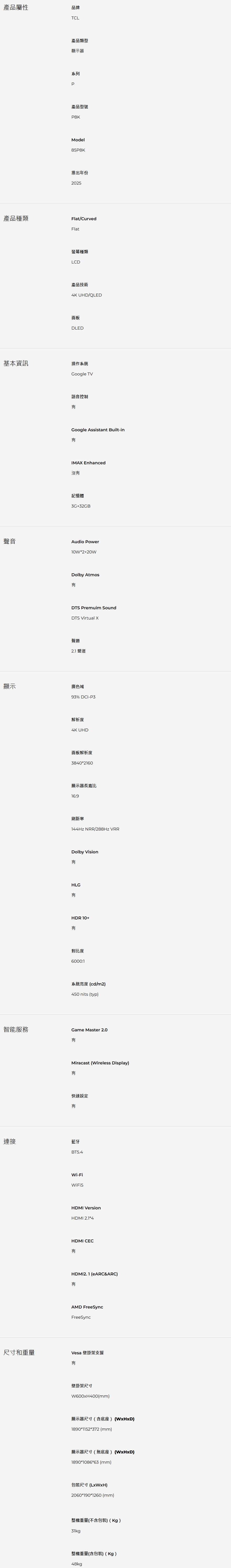 TCL 85P8K 85吋 P8K QLED Google TV顯示器