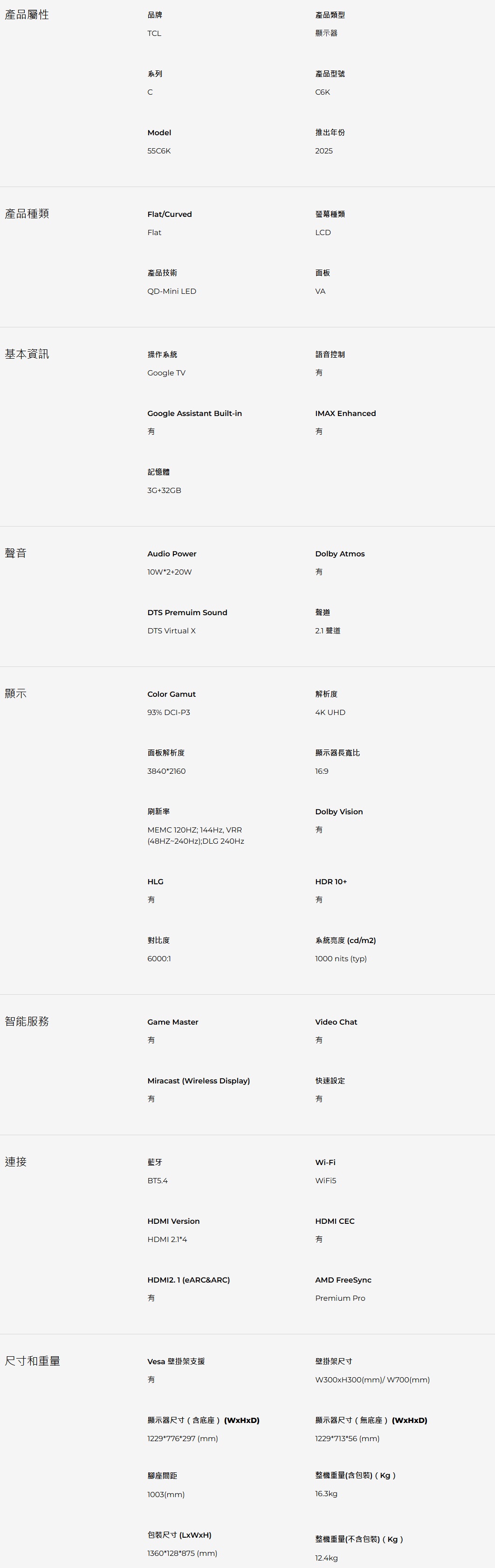 TCL 55C6K 55吋 C6K 頂級QD-Mini LED Google TV顯示器