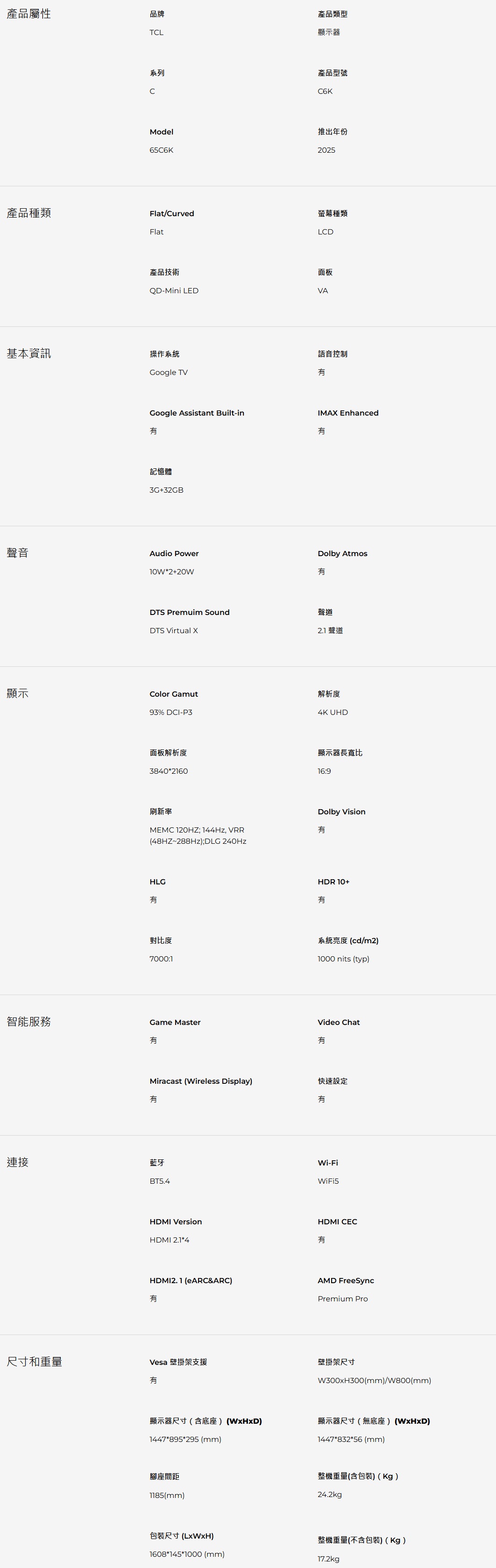 TCL 65C6K 65吋 C6K 頂級QD-Mini LED Google TV顯示器