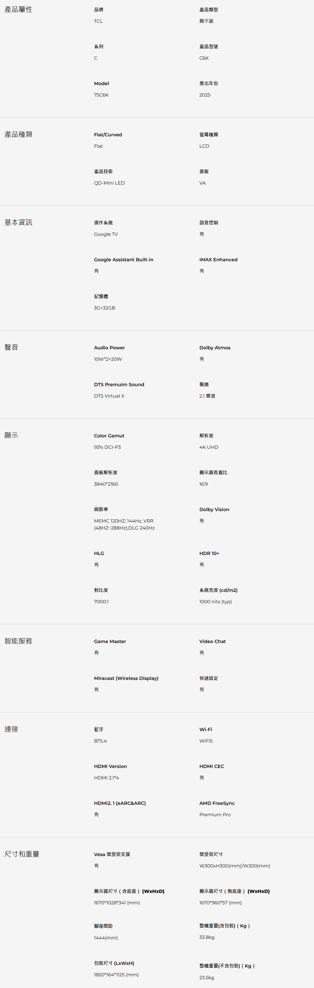 TCL 75C6K 75吋 C6K 頂級QD-Mini LED Google TV顯示器