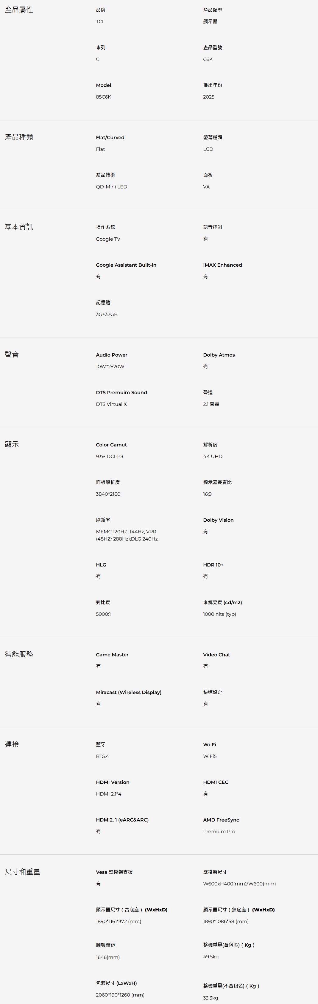 TCL 85C6K 85吋 C6K 頂級QD-Mini LED Google TV顯示器
