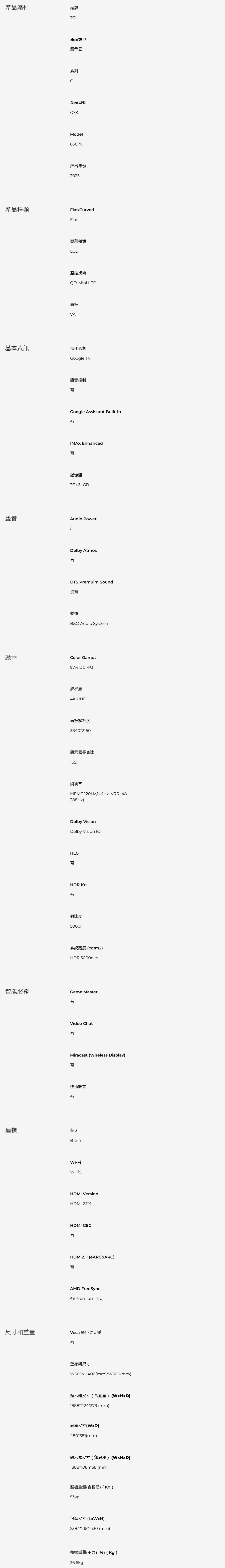TCL 85C7K 85吋 C7K 頂級QD-Mini LED Google TV顯示器