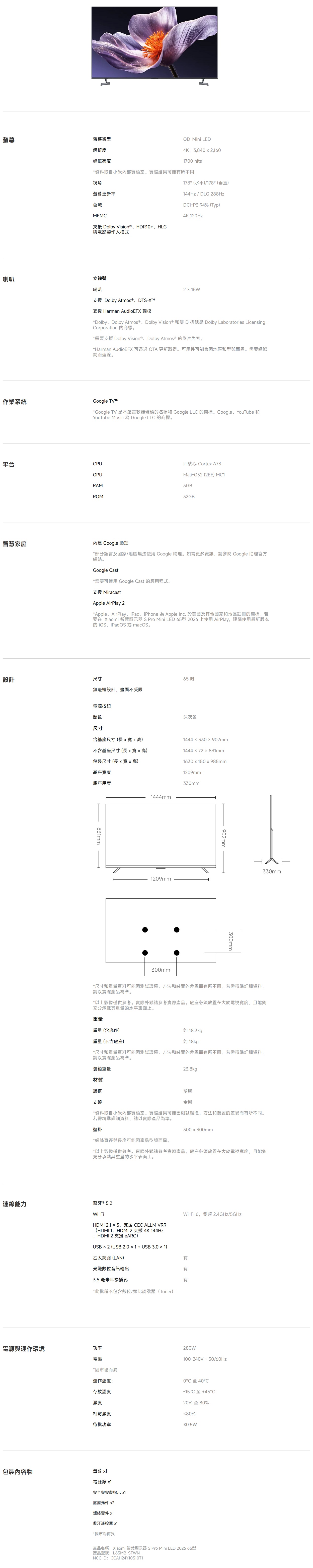 小米Xiaomi 65型 4K Mini LED智慧顯示器 S Pro Mini 65 2026