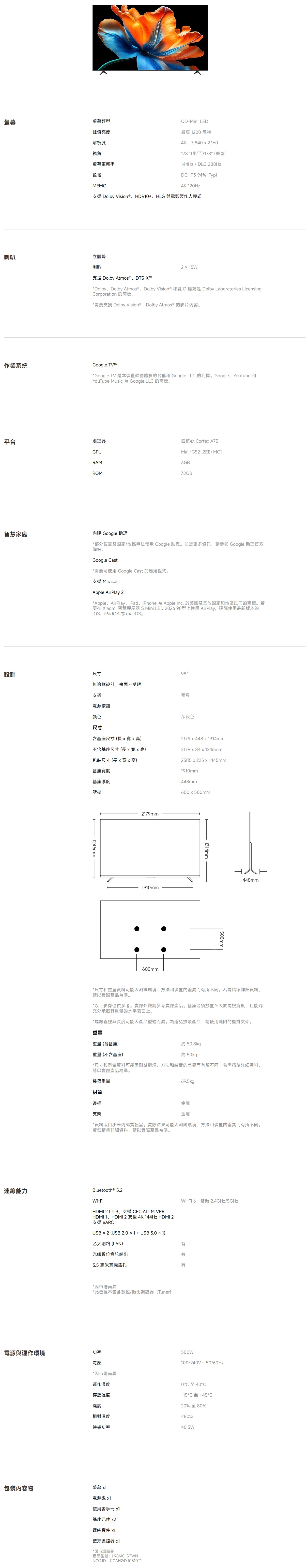 小米Xiaomi 98吋 4K Mini LED智慧顯示器 S Mini 98 2026