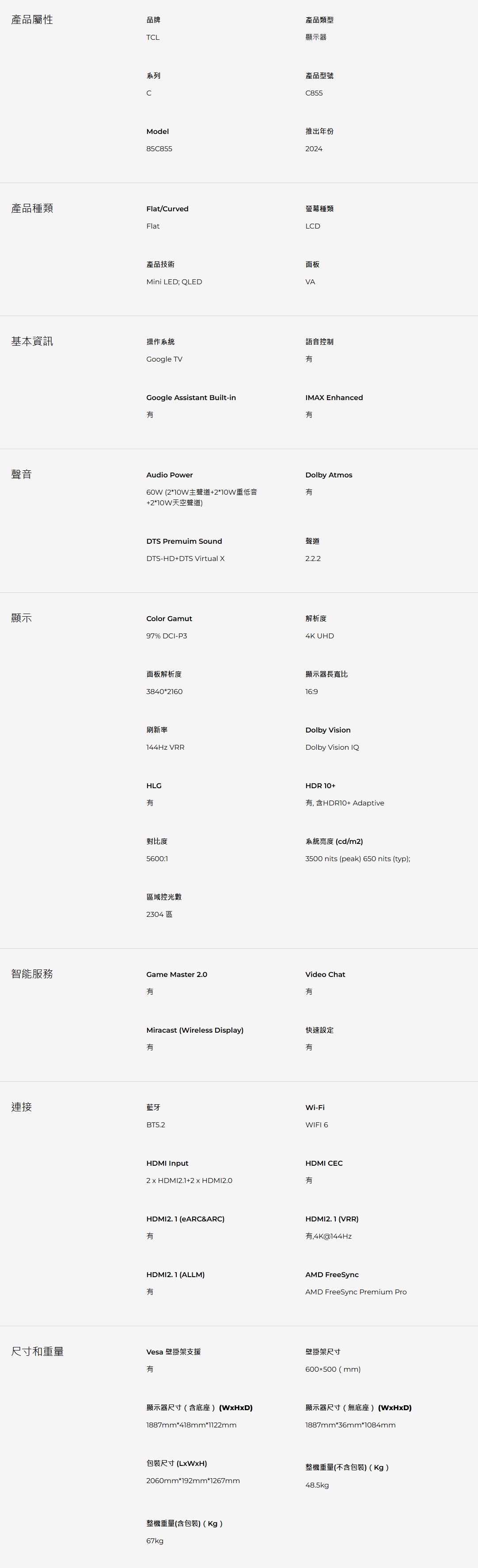 TCL 85C855 85吋 QD-Mini LED Google TV顯示器