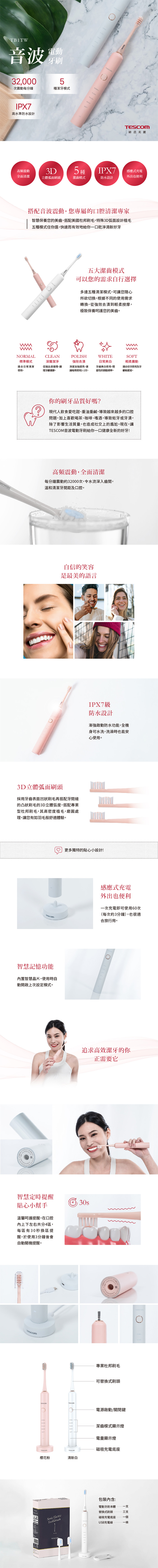 TESCOM TB1TW 音波電動牙刷 電動牙刷 五大潔齒模式 防水 公司貨