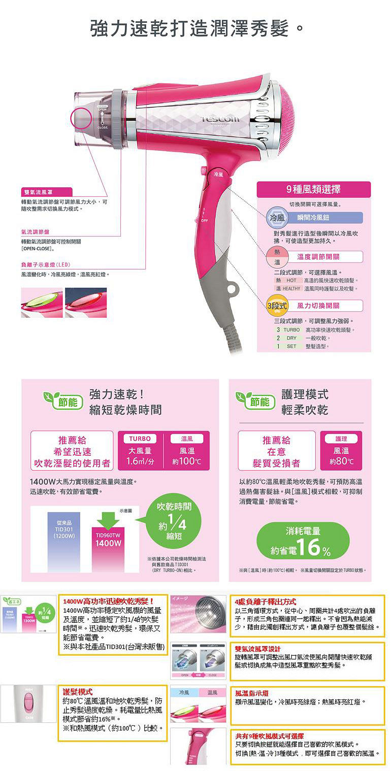 TESCOM TID960 TID960TW負離子吹風機 雙氣流風罩 公司貨 保固12個月