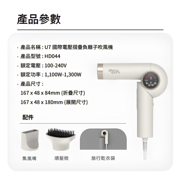 Bianco di puro 彼安特 U7 國際電壓超輕量摺疊高速負離子護髮吹風機 HD043/HD044 -