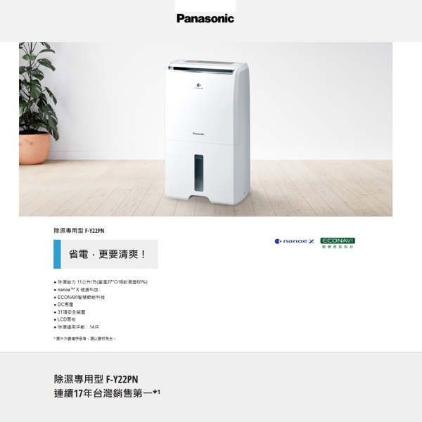 Panasonic 國際牌 11L nanoeX 除濕機F-Y22PN