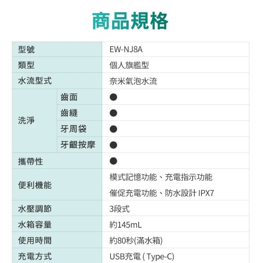 Panasonic 國際牌旗艦型無線奈米氣泡國際電壓充電式沖牙機 EW-NJ8A