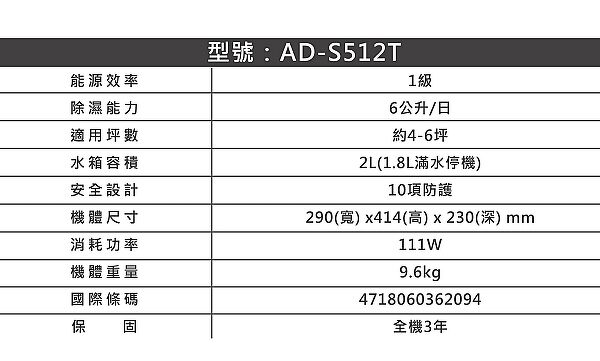 SAMPO 聲寶 6L 微電腦除濕機 AD-S512T -