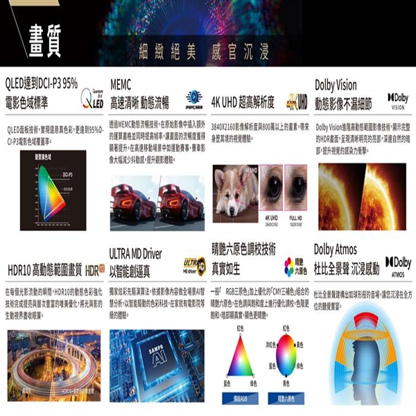 • QLED量子點高色域 色域標準DCI-P3達95%以上