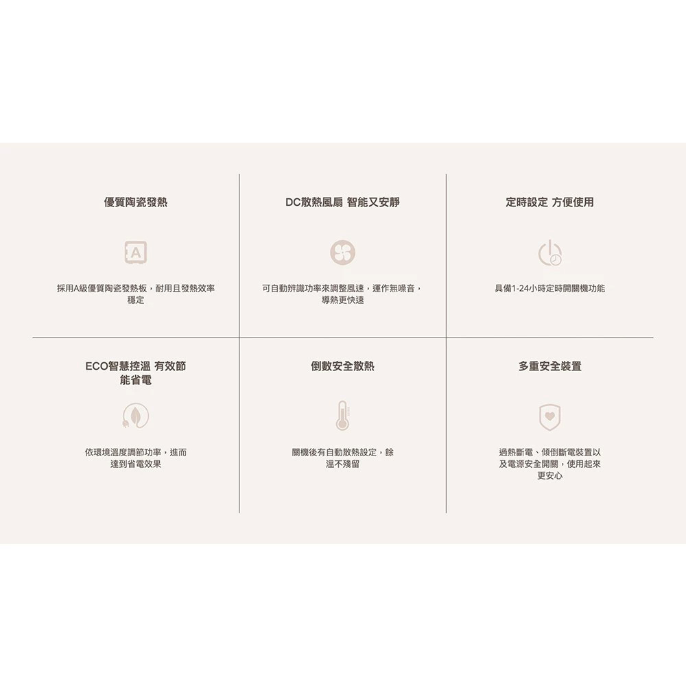 • 優質陶瓷發熱 - 採用A級優質陶瓷發熱板,耐用且發熱效率穩定