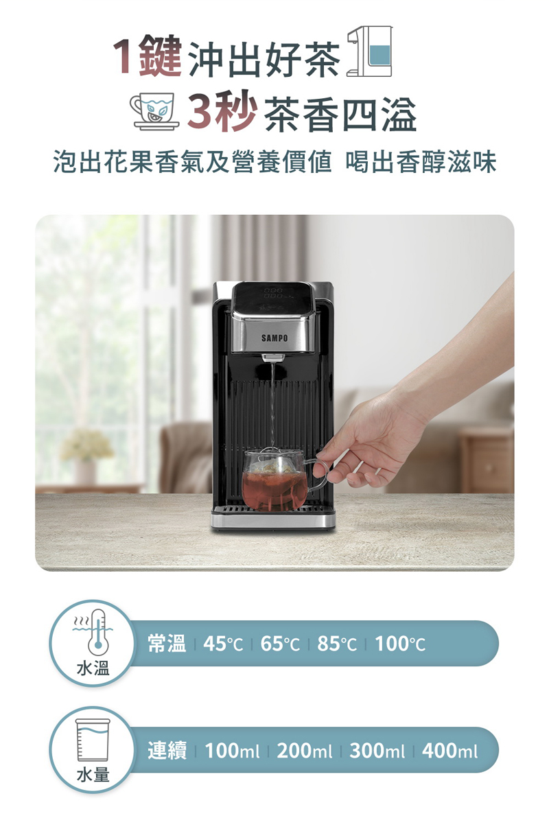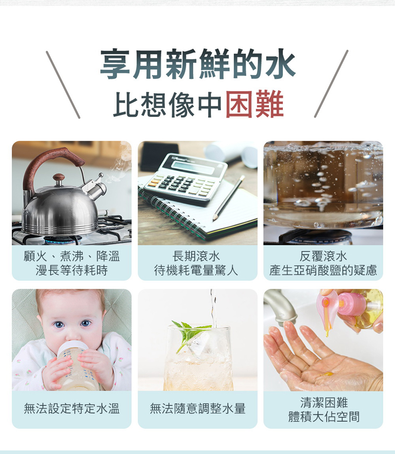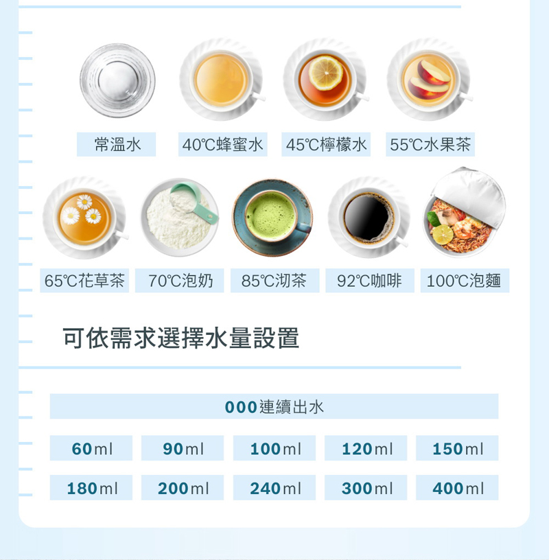 生活日常的日常用水 -常用水溫:常溫水、45℃、65℃、85℃、100℃、常用水量:連續出水、100ml、200ml、300ml、400ml