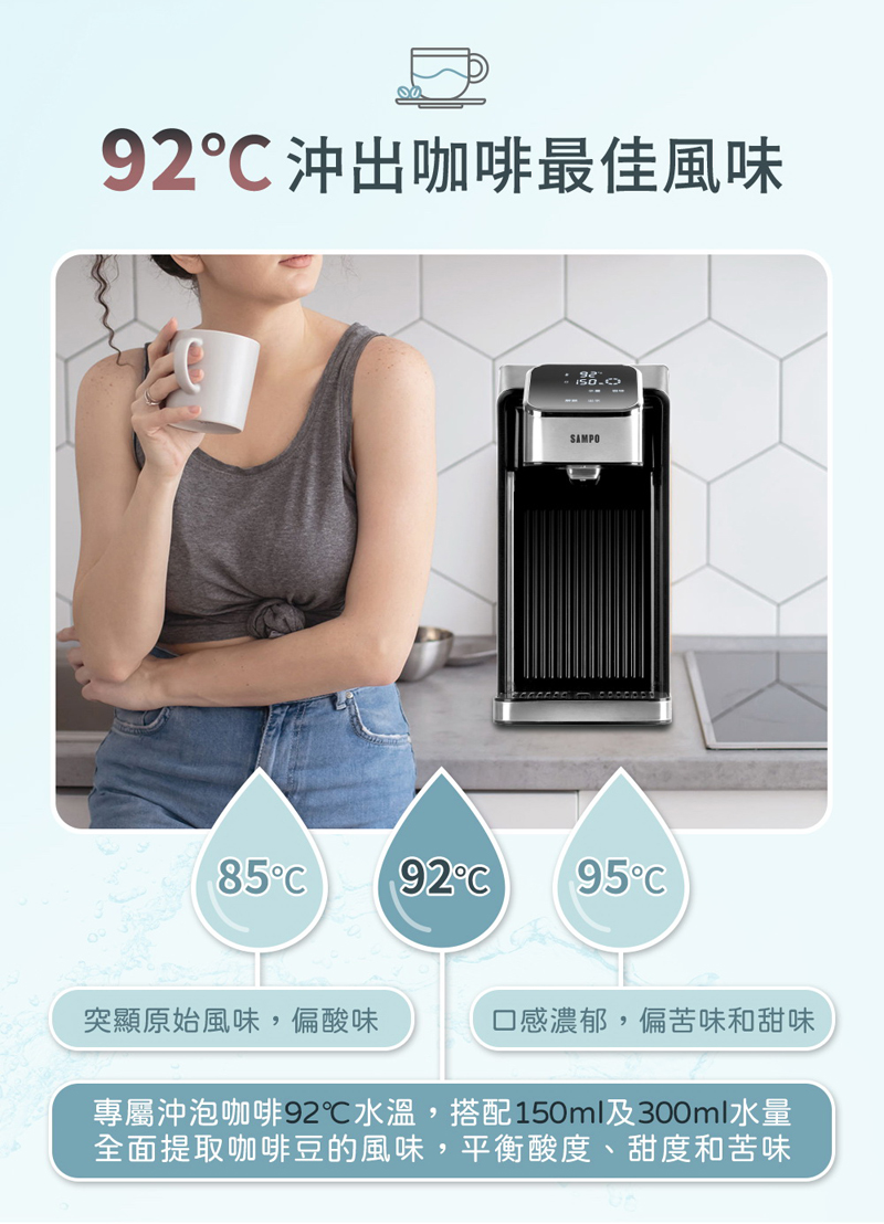92℃咖啡的專屬溫度,可搭配150ml 和300ml 水量