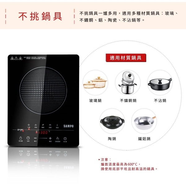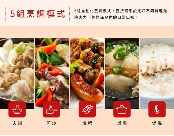 5組烹調模式選擇:火鍋、燒烤、褒湯、煎炒、保溫