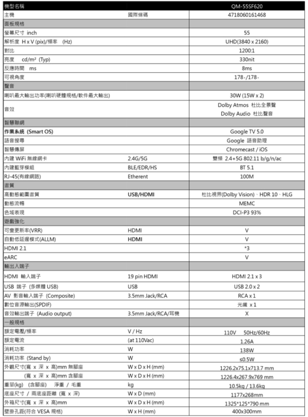 SAMPO 聲寶 55吋 4K聯網UHD Smart LED智慧顯示器 QM-55SF620
