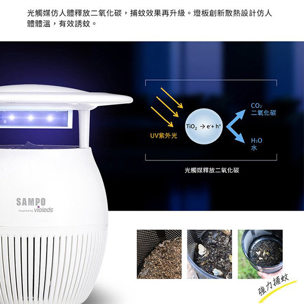 TiO2光觸媒塗層,透過UV光照射在玻璃上的光觸媒塗層,產生仿人體二氧化碳,以強化誘蚊效果,仿人體溫散熱燈板技術,有效誘蚊