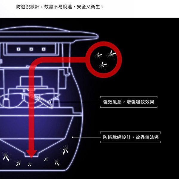 蚊蟲防逃脫裝置:關閉電源時,盒內蚊蟲可能還活著,可防止蚊蟲逃脫