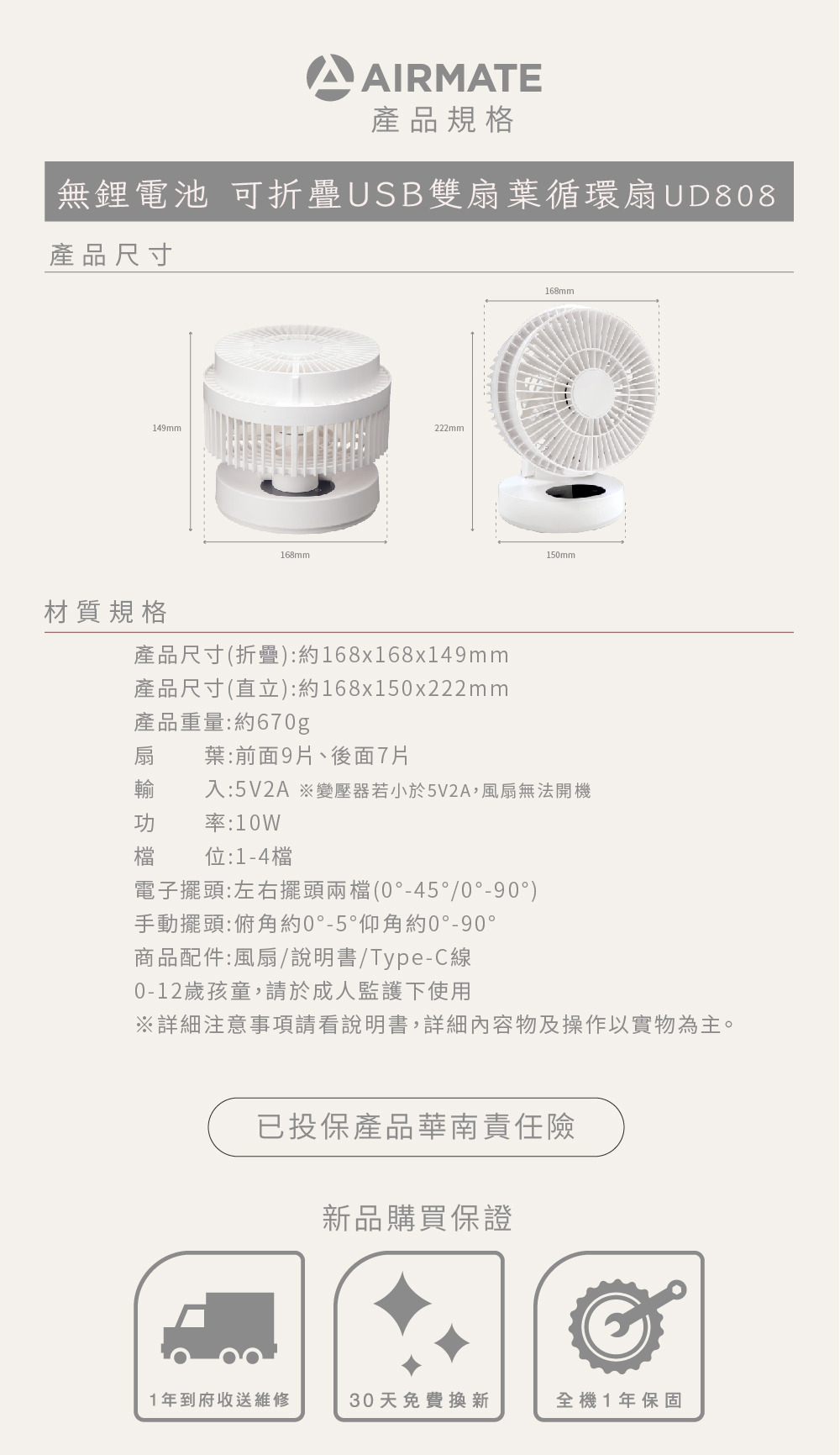 Pre OrderAIRMATE 艾美特 簡約可折疊USB雙扇葉透涼扇(不含鋰電池) I-UD808 -