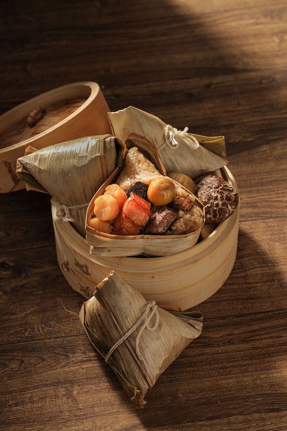 傳統風味肉粽使用台灣糯米以蔥酥、金鉤蝦、魷魚爆香、再包入肥瘦適中的豬肉、干貝、香菇及鹹蛋黃等多種豐富餡料,完成這道豐潤圓滿的美粽。