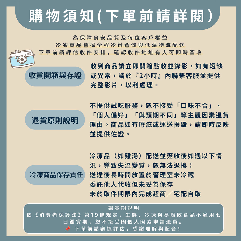 為保障您的權益,請於收到物品後儘速錄影開箱檢視是否正確與完整,若有任何問題請立即與客服人員聯繫。