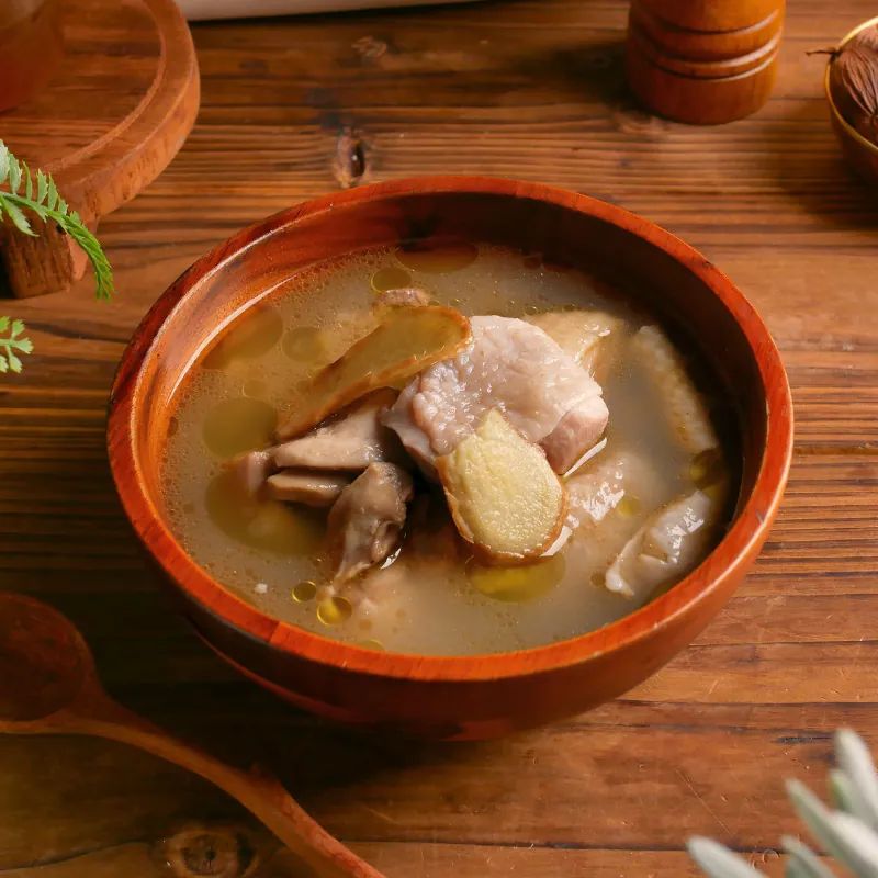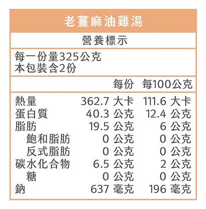 內容物:雞高湯(水、雞骨、豬骨)、去骨雞腿丁、麻油、薑片、鹽、米酒