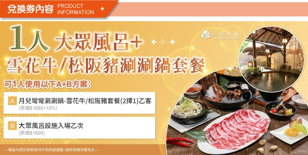 【北投大地酒店】1人大眾風呂+雪花牛/松阪豬涮涮鍋套餐