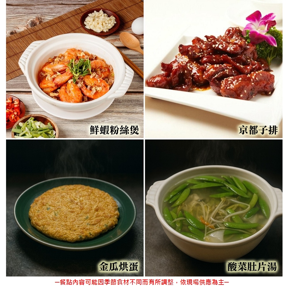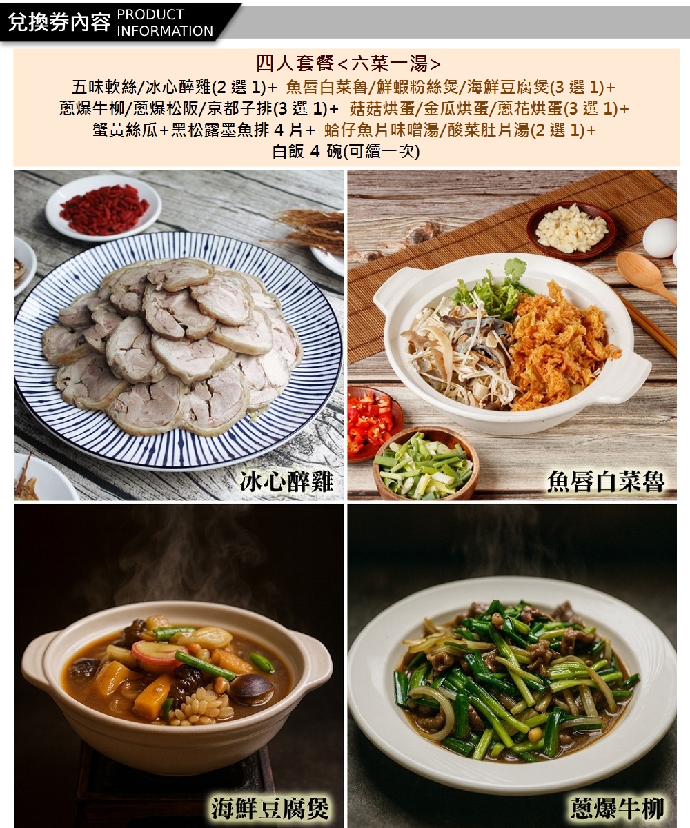 7.餐點內容:六菜一湯 <五味軟絲/冰心醉雞(二選一)、魚唇白菜魯/鮮蝦粉絲煲/海鮮豆腐煲(三選一)、蔥爆牛柳/蔥爆松阪/京都子排(三選一)、菇菇烘蛋/金瓜烘蛋/蔥花烘蛋(三選一)、蛤仔魚片味噌湯/酸菜肚片湯(二選一)、蟹黃絲瓜、黑松露墨魚排4片、白飯4碗(可續一次) >。