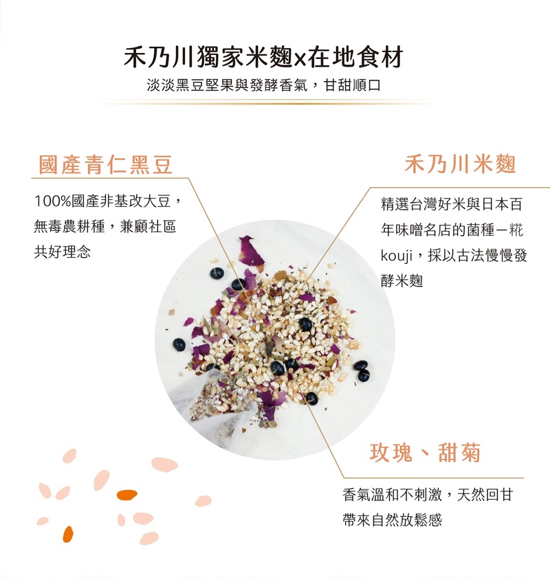 * 口味特色:青仁黑豆 × 玫瑰 × 禾乃川米麴 × 甜菊