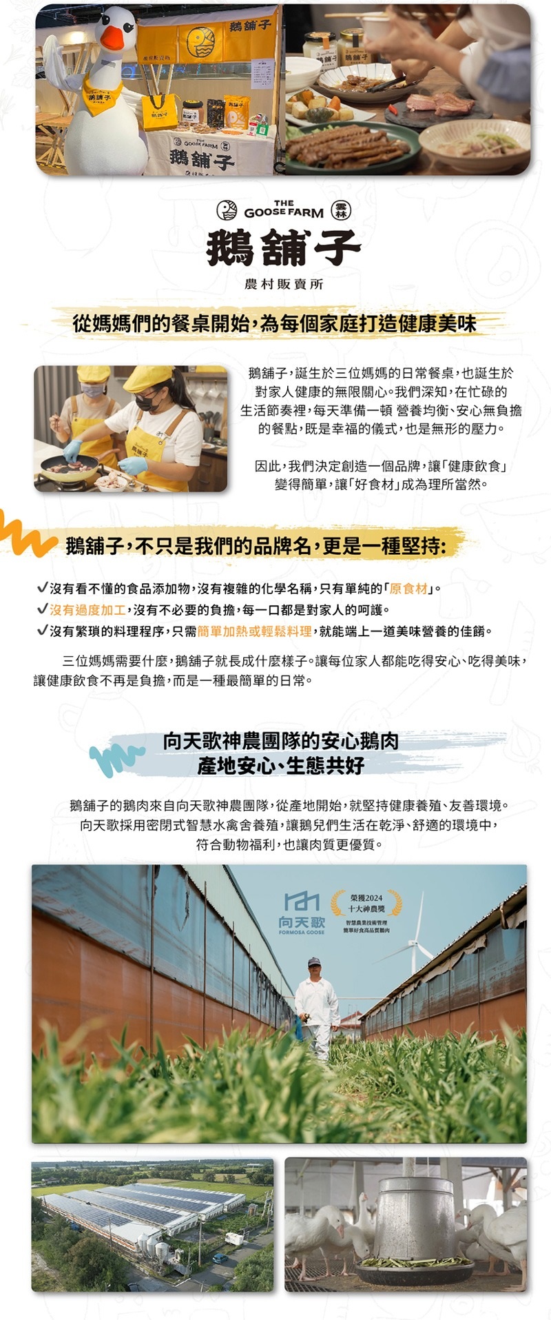 選用雲林白羅曼鵝,以慢火清燉熬煮出鵝肉的優質蛋白及氨基酸