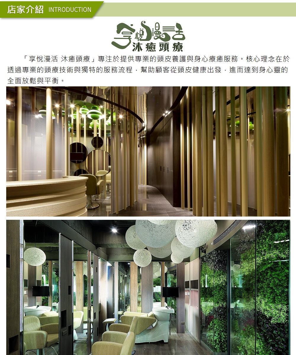 內容:選用專屬髮品+肩頸寧心按摩+手部舒緩按摩+漫活釋壓洗髮+頭刮+淋巴引流八部曲+瞬效滋養修護+顱部水癒潔淨+毛鱗順髮吹風,共計40分鐘。