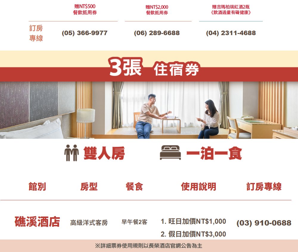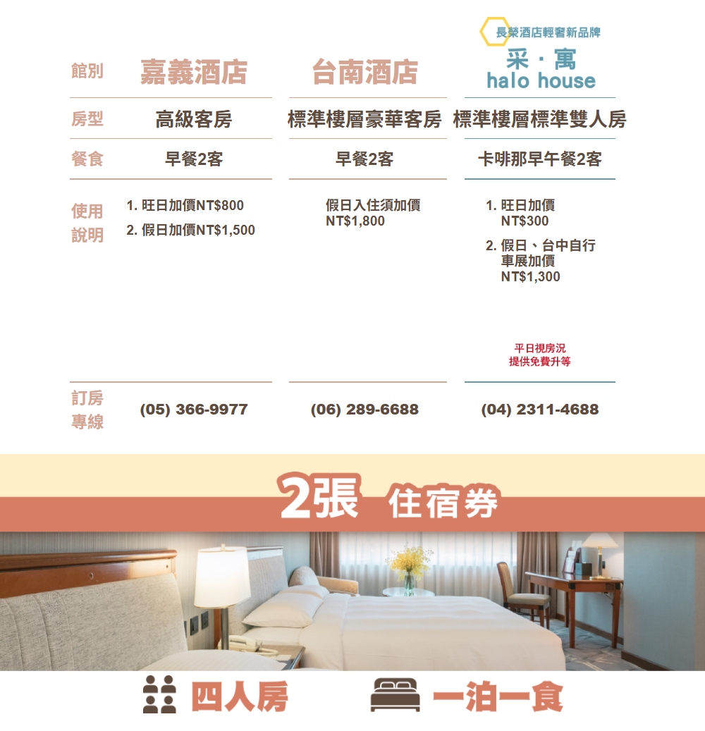 嘉義:1張享高級客房含2客早餐,2張享南院景高級家庭房含4客早餐加贈500元餐飲抵用券,平日週五及暑假週日至週四加價800元,假日及暑假週五加價1500元。