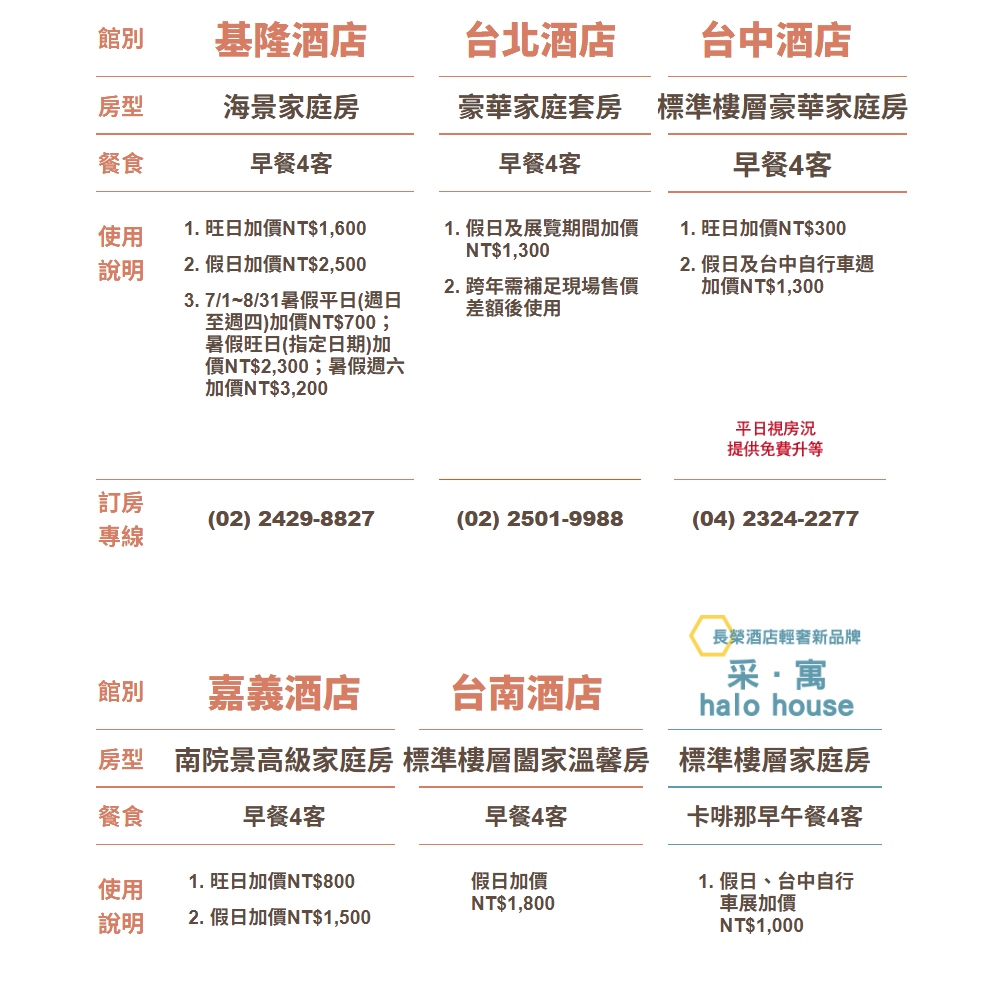 台中:1張享高級客房含2客早餐,2張享豪華家庭房含4客早餐,平日視房況升等,旺日加價300元,假日及展期加價1300元。