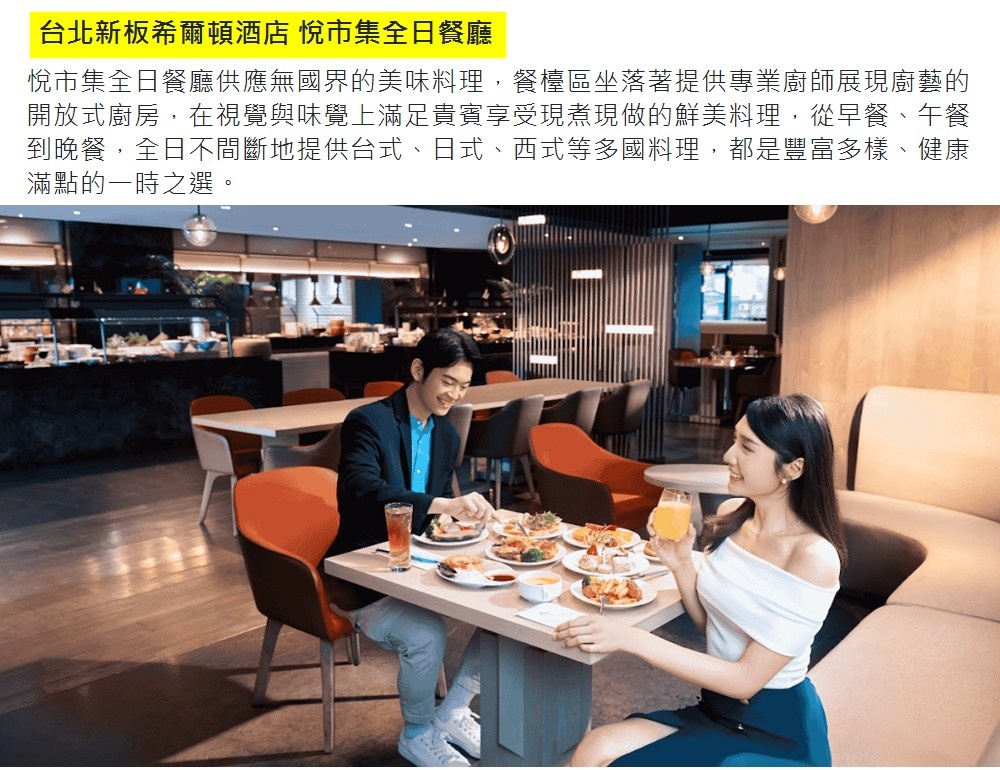 *台北新板希爾頓 悅市集平日自助午或晚餐1客。(週五晚餐及假日需加價300元)